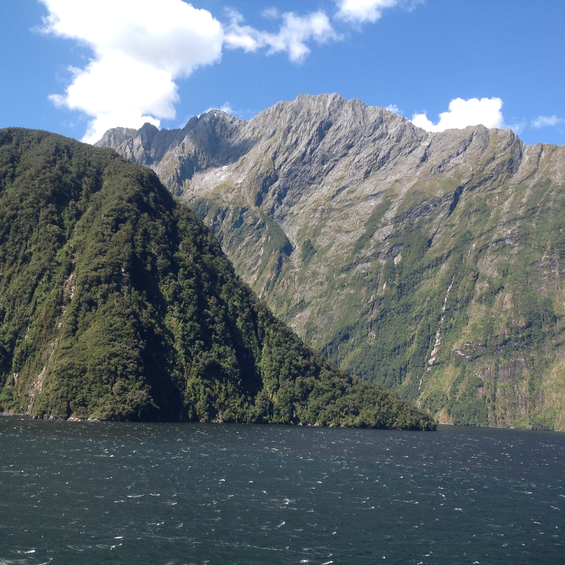Heading west, we sailed along the Fjordland National Park that stretches over two hundred kilometers of mountains, called the Southern Alps, and counts fourteen spectacular fjords. The rocky mountains were original glaciers now covered with vegetation where rain forest clings.